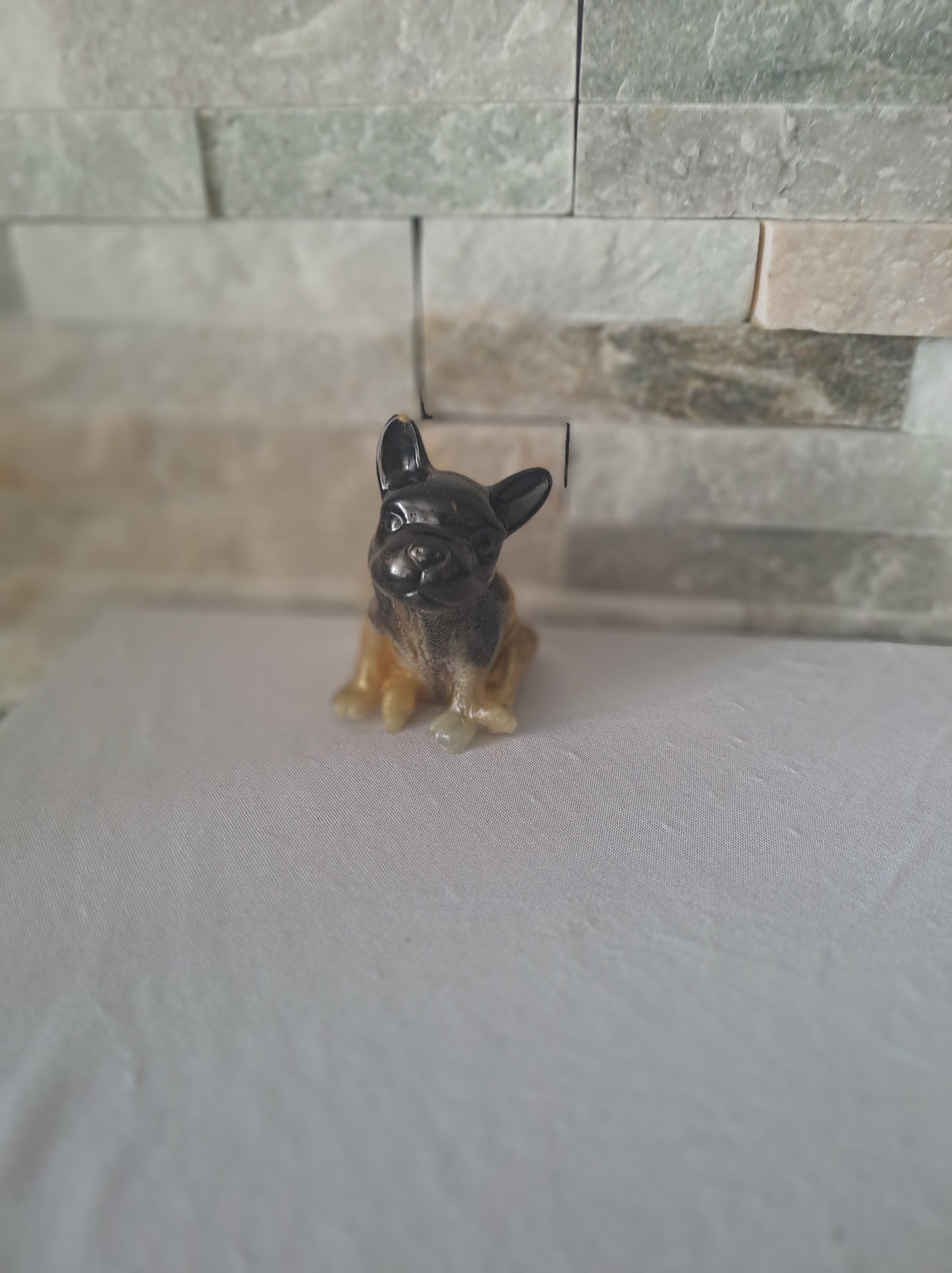 Figurine décorative en forme de bulldog français réalisée en résine époxy. Design détaillé et finition brillante. Personnalisation possible pour les couleurs sans supplément.