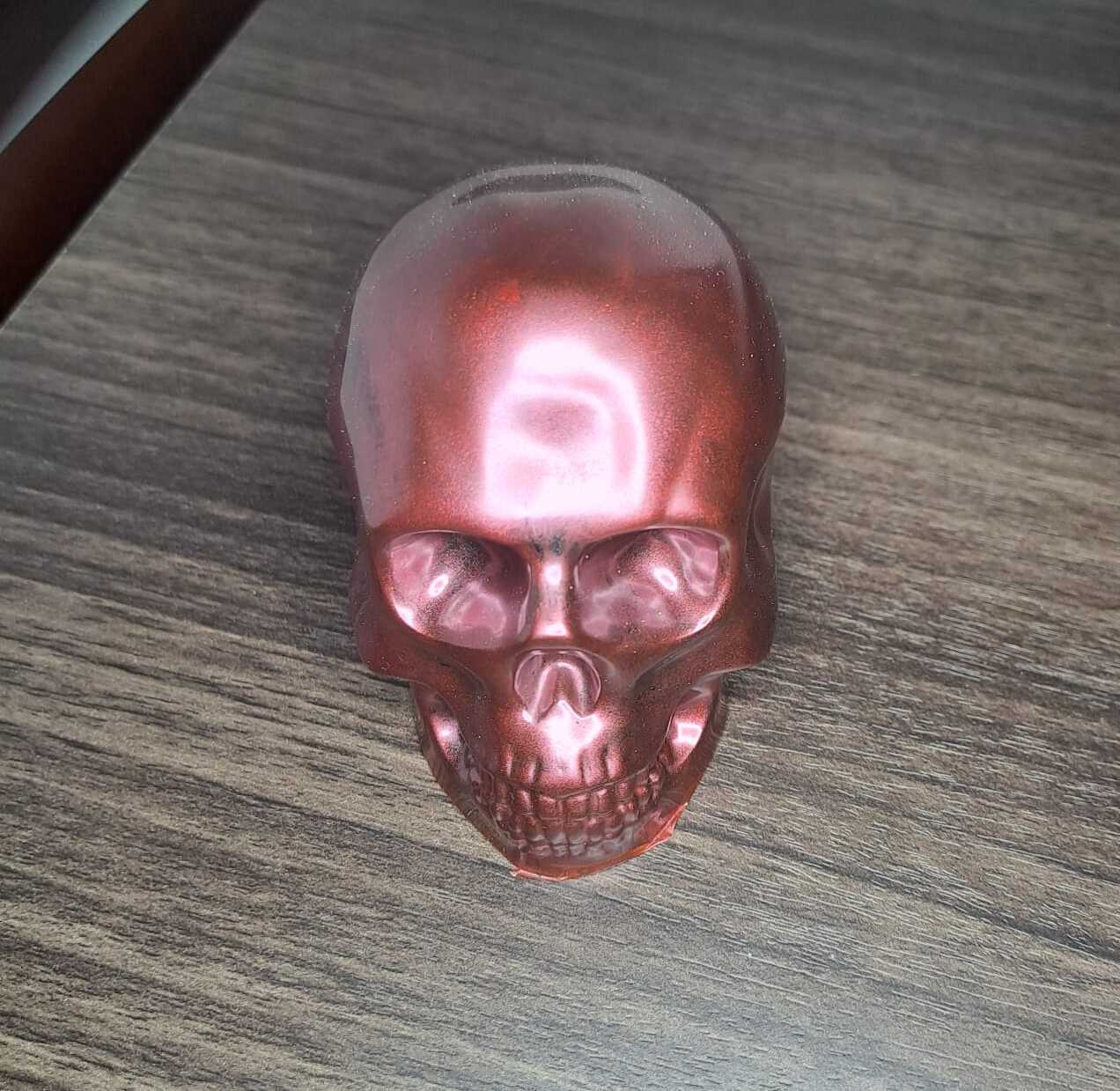 Sculpture décorative en forme de crâne réalisée en résine époxy. Disponible en plusieurs couleurs métallisées. Personnalisation possible pour les couleurs sans supplément.