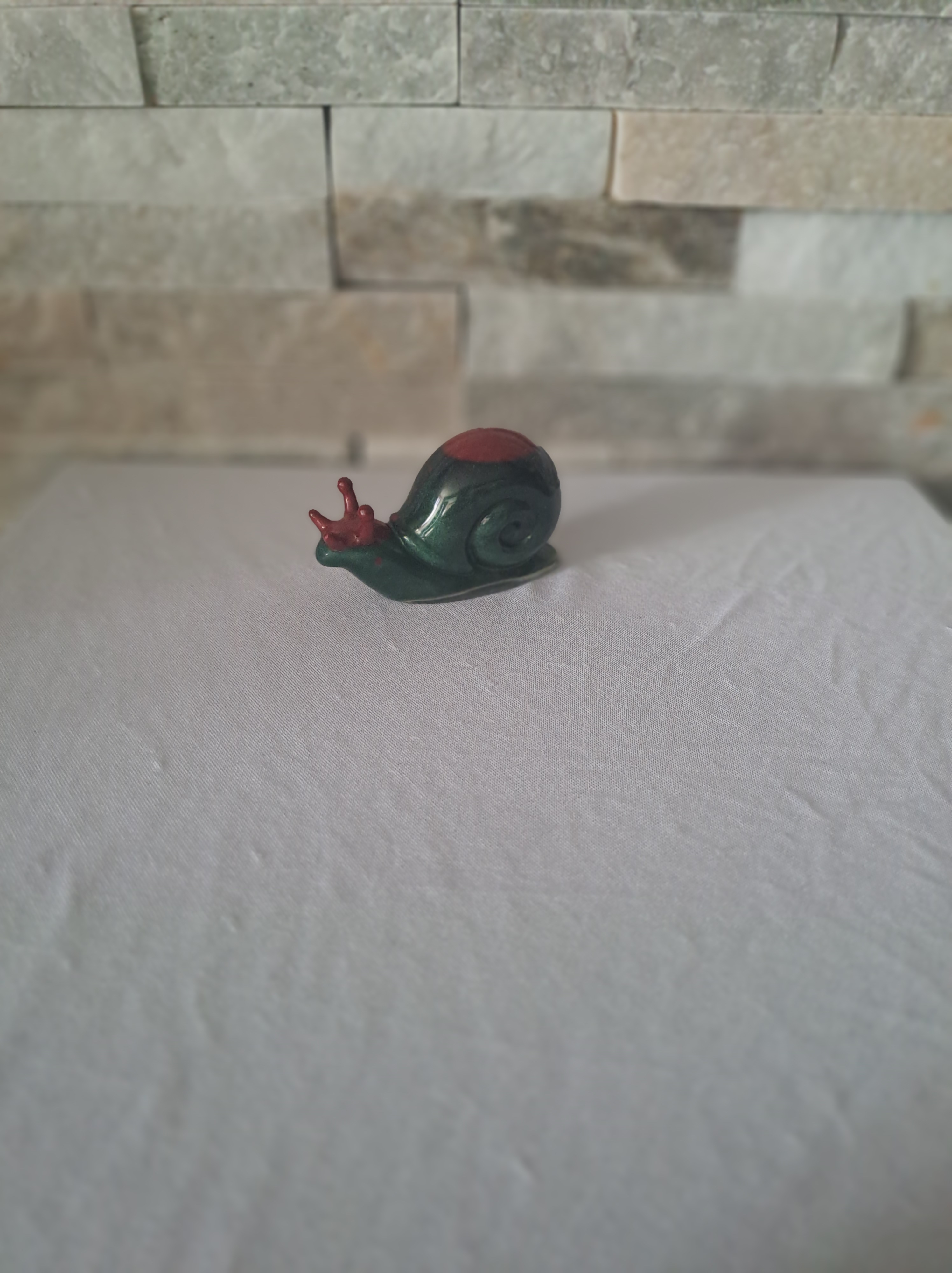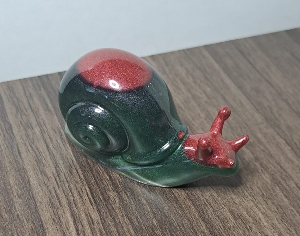 Figurine décorative en forme d’escargot réalisée en résine époxy. Design naturaliste avec coquille colorée. Personnalisation possible pour les couleurs sans supplément.