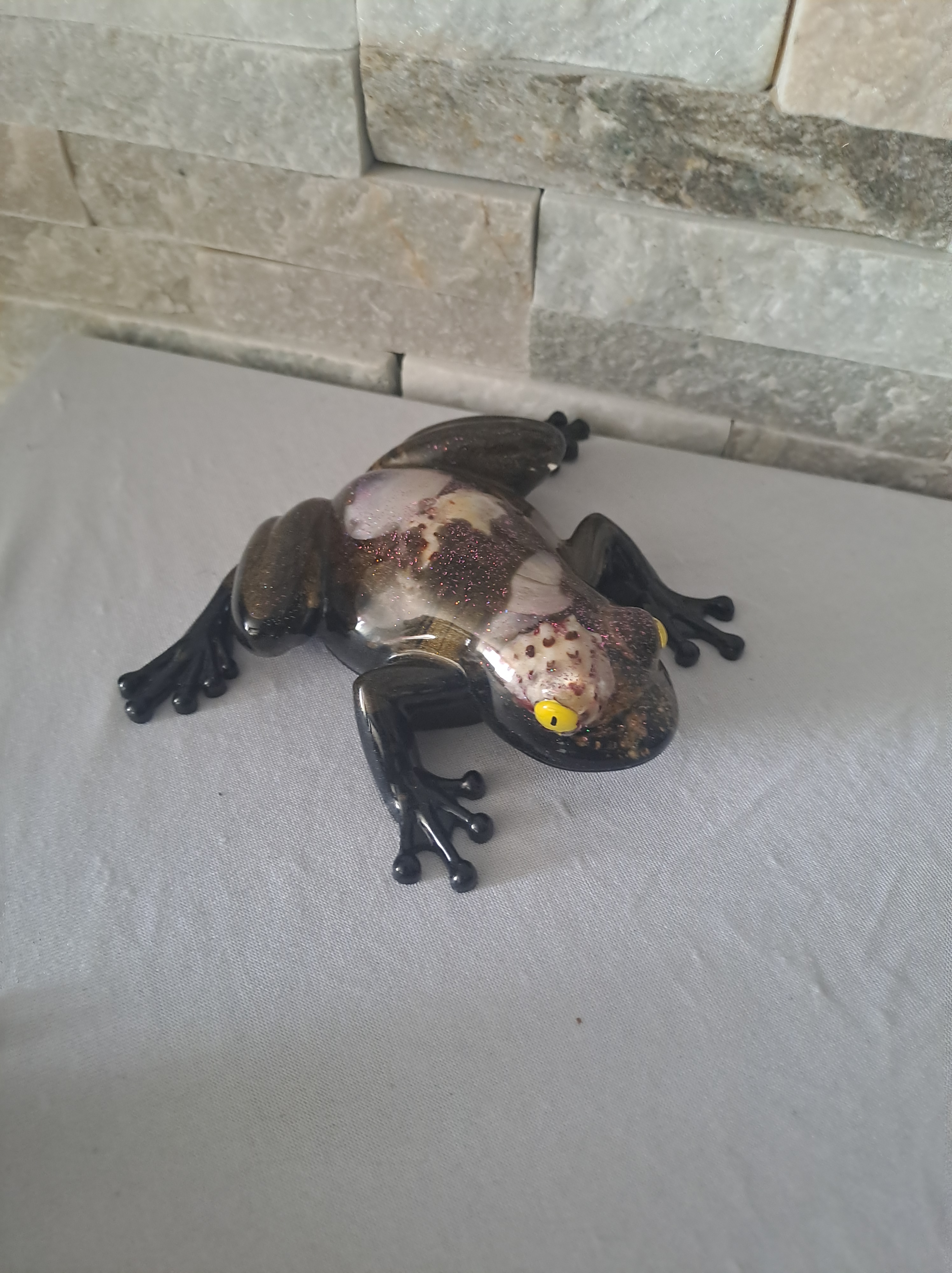 Figurine décorative en forme de grenouille réalisée en résine époxy. Disponible en plusieurs couleurs. Personnalisation possible pour les couleurs sans supplément.