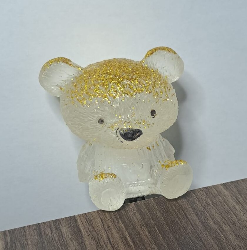 Figurine décorative en forme d’ourson avec fonction lumineuse intégrée, réalisée en résine époxy. Personnalisation possible pour les couleurs sans supplément.