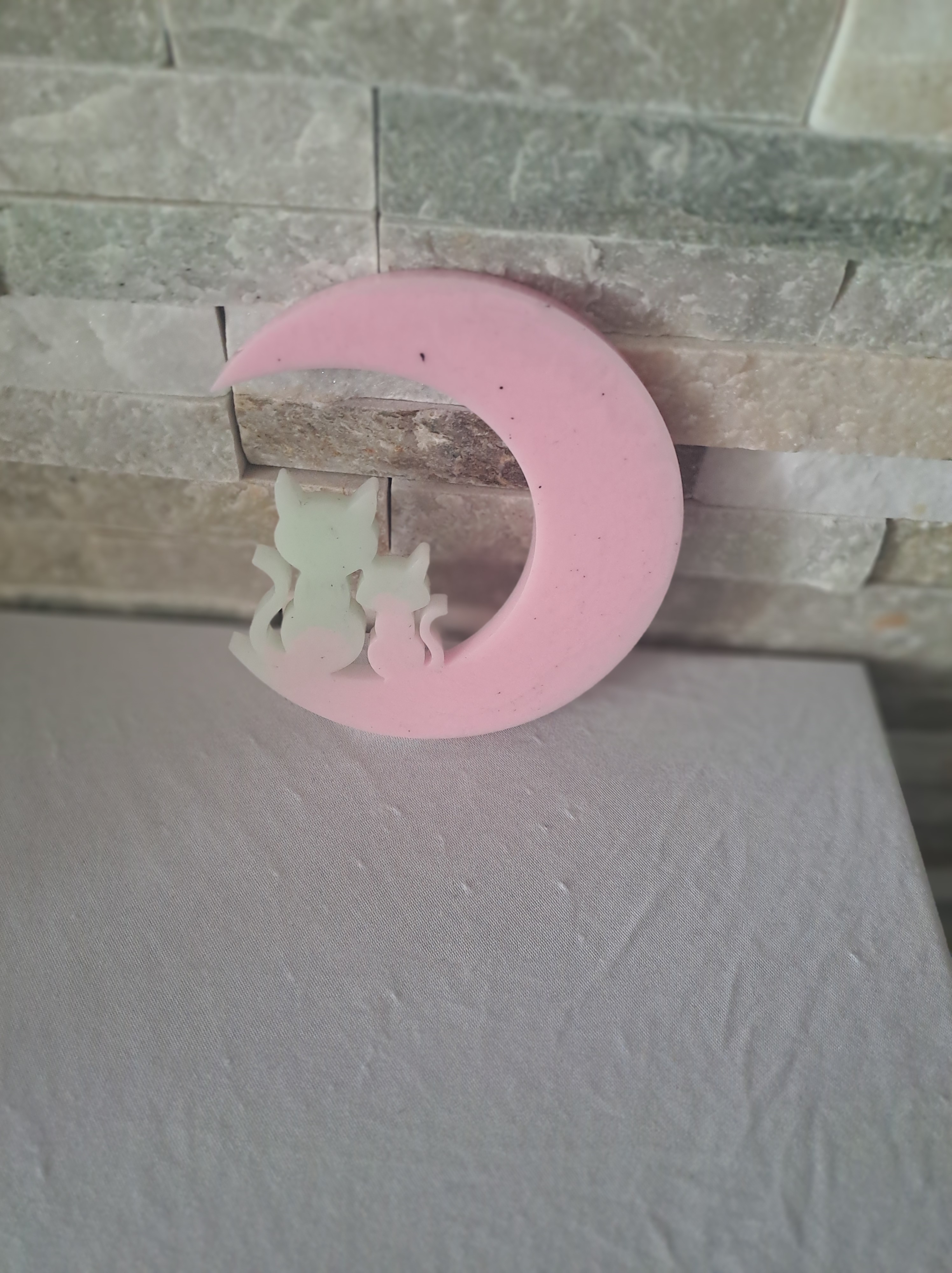Décoration murale en résine époxy représentant un quartier de lune avec des silhouettes de chats. Personnalisation possible pour les couleurs sans supplément.