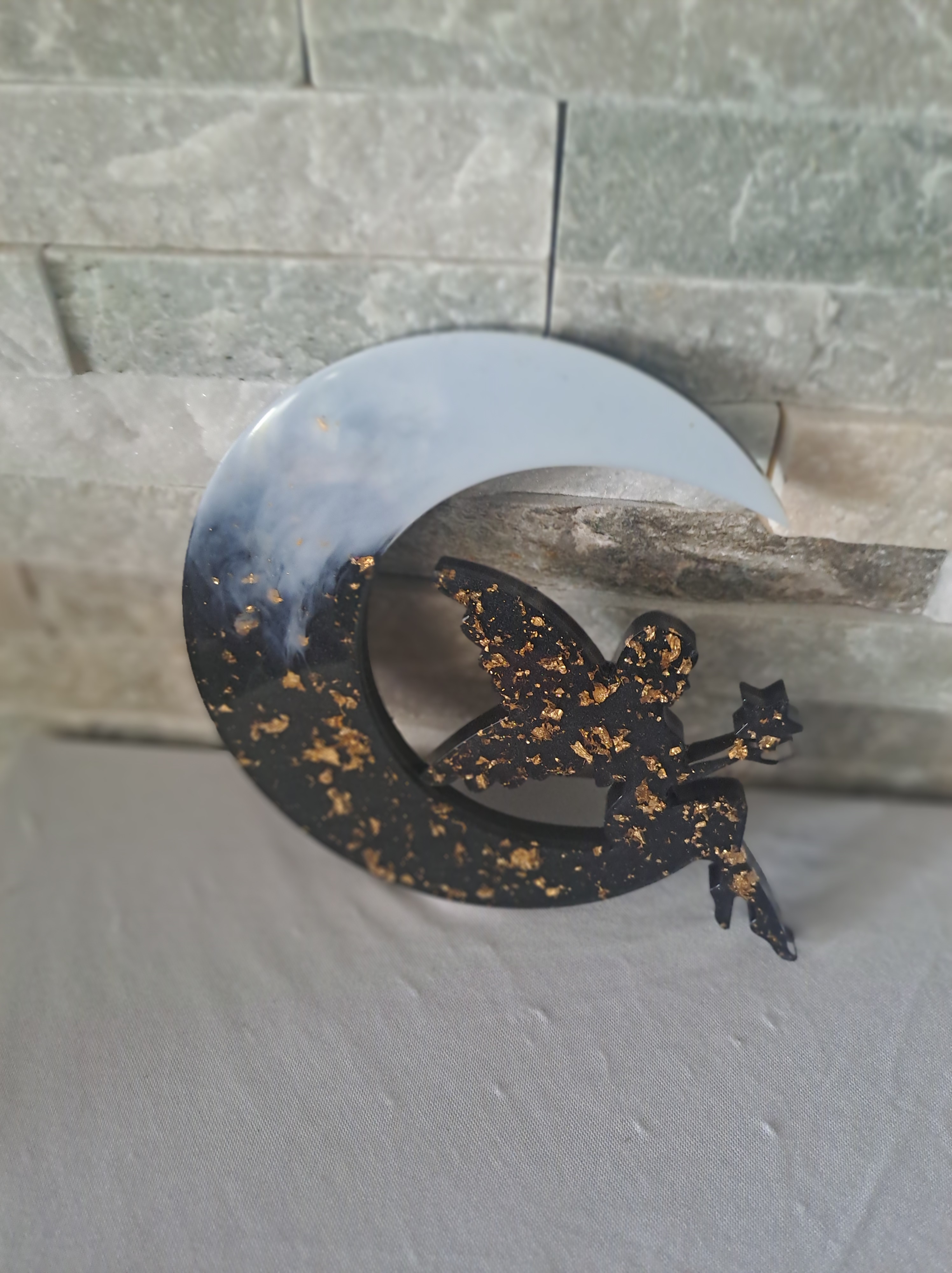 Décoration murale en résine époxy représentant un quartier de lune avec une silhouette de fée. Personnalisation possible pour les couleurs sans supplément.
